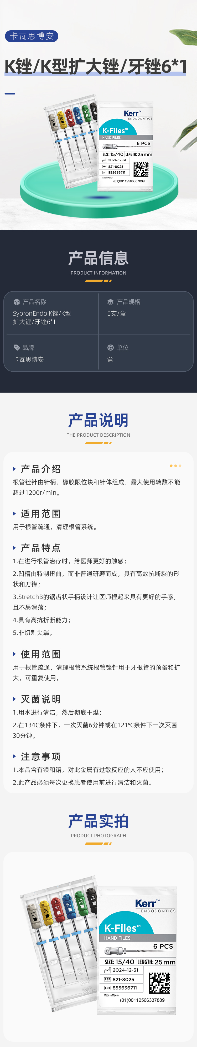 科尔(SybronEndo)K锉/K型扩大锉/牙锉6*1