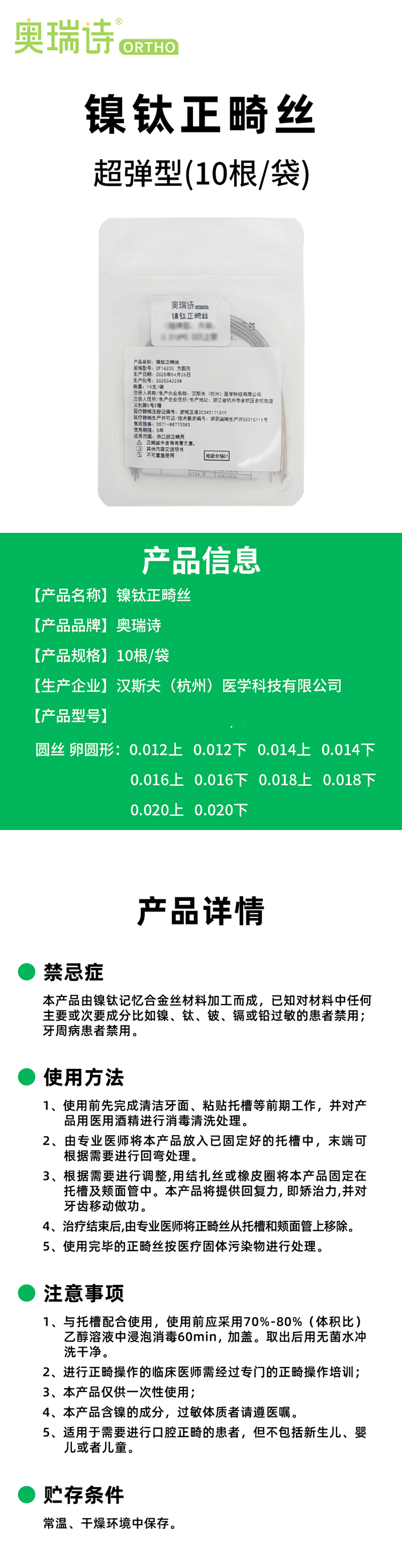奥瑞诗 正畸丝/镍钛丝/镍钛超弹型方丝(卵圆形)10*1